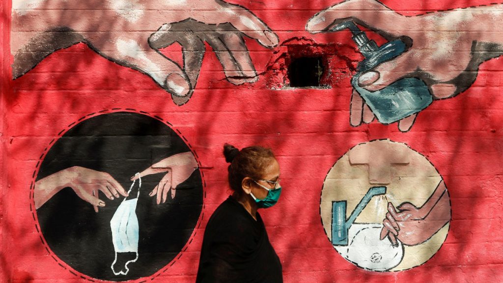 A woman walks past a graffiti, on a street, amidst the spread of the coronavirus disease (COVID-19) in Mumbai.